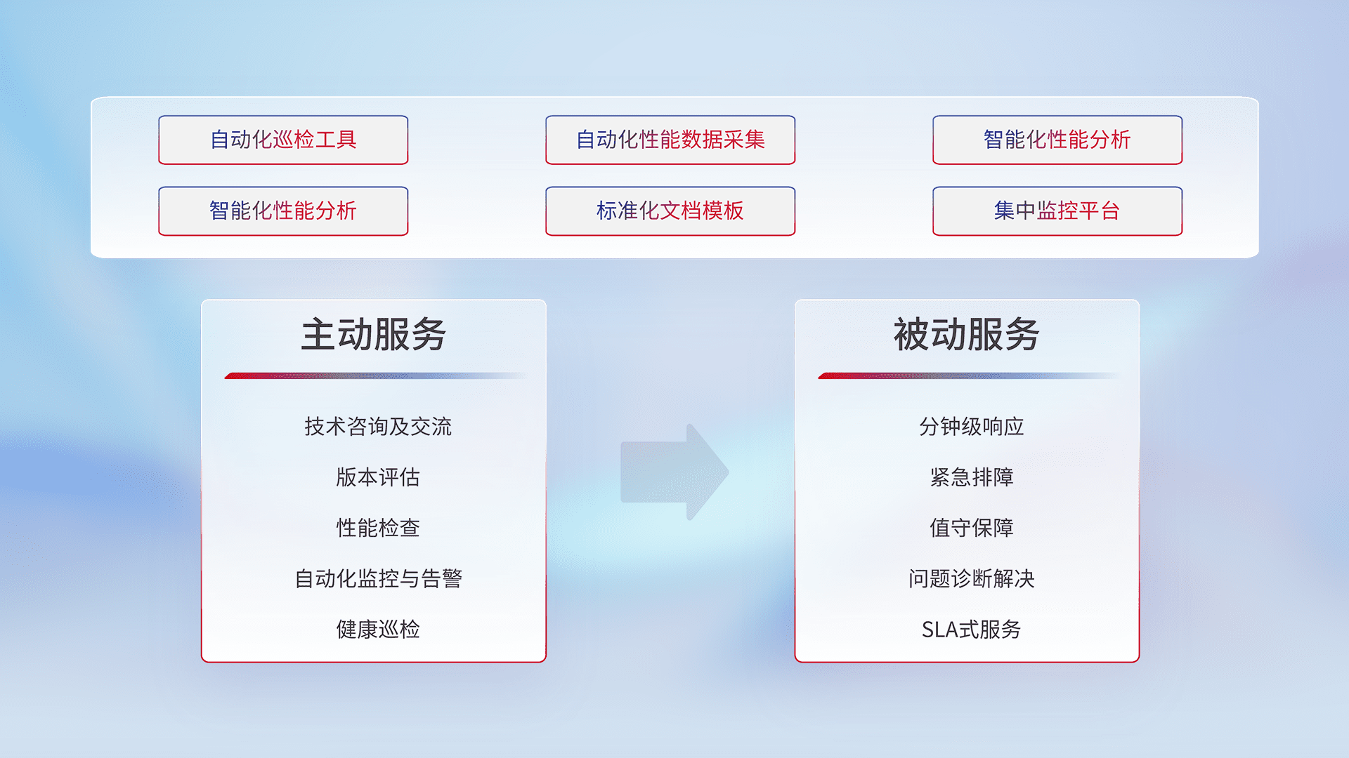 智能化工具和标准化文档,,,保障服务质量,,,,提供主动服务(包含技术咨询、、、、版本评估、、、、性能检查、、、、自动化监控与告警、、、健康巡检)和被动服务包含(分钟级响应、、、、紧急排障、、、、值守保障、、、问题诊断解决、、、、SLA服务)。。。